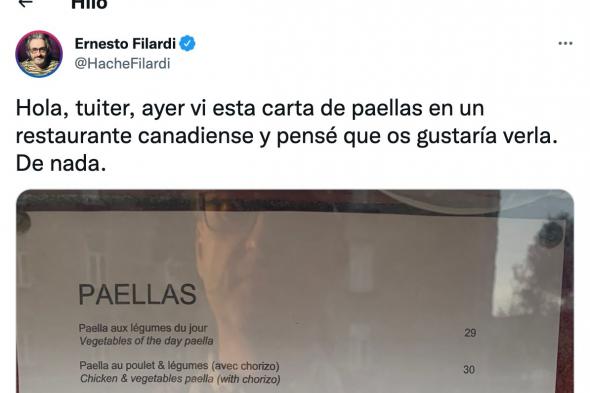 El tuitero Ernesto Filardi, conocido por sus hilos y sus historias desde Canadá, ha dejado a muchos sin palabras en Twitter al compartir la carta de paellas que ha encontrado paseando por la ciudad.