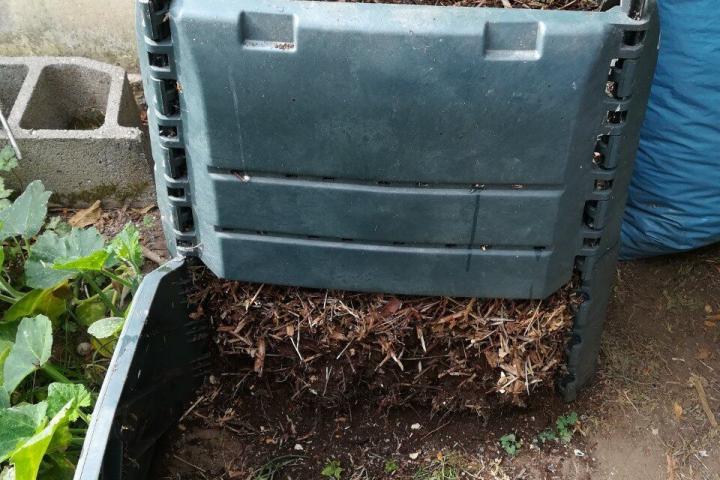 - Deposita los biorresiduos en el compostero. Primero añade una base de estructurante de ≈10cm. Encima echas el resto del material orgánico, a diario o cada pocos días.