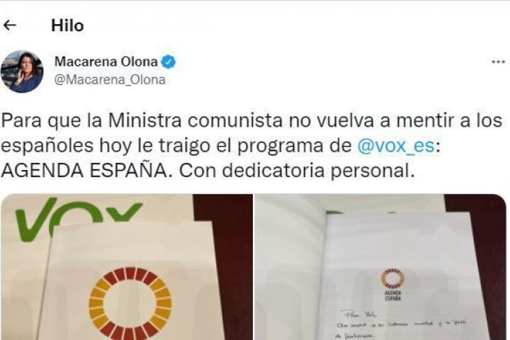 La diputada de Vox Macarena Olona ha protagonizado un llamativo momento en el Congreso cuando ha llevado a la Cámara el programa de Vox con una dedicatoria para la vicepresidenta segunda y ministra de Trabajo, Yolanda Díaz.