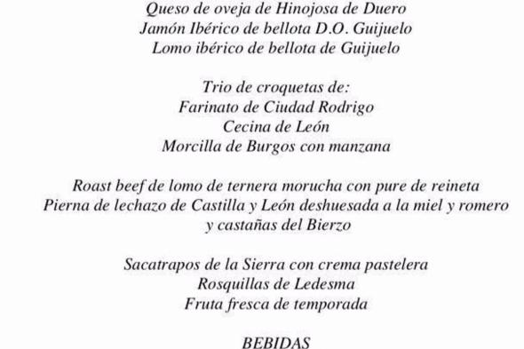 En el menú, que ha trascendido en la sala de prensa habilitada junto al lugar de la reunión, se contempla igualmente servir roast beef de lomo de ternera morucha con puré de reineta y pierna de lechazo de Castilla y León deshuesada a la miel y romero y con castañas del Bierzo.