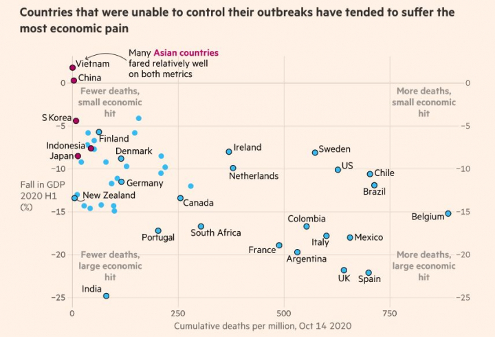 Pero, ¿se pueden enfrentar ambos términos? ¿Existe realmente un dilema? El prestigioso diario británico Financial Times, en un extensísimo reportaje sobre la evolución de la pandemia, da respuesta a estas preguntas con un gráfico muy sencillo.