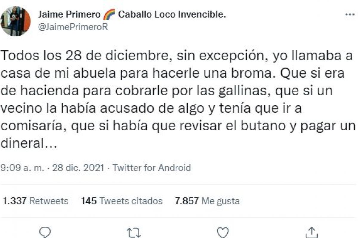 Un chico de Twitter, Jaime Primero, compartió en un hilo cómo solía vivir el día de los inocentes con su abuela hasta que un año una broma se le fue de las manos con tal de evitar romper su ilusión. Según explica el tuitero, al principio su abuela le solía seguir el juego para hacerle feliz, aunque fuera perfectamente consciente de que se trataba de una broma.