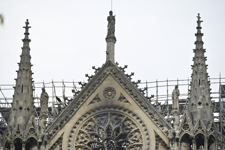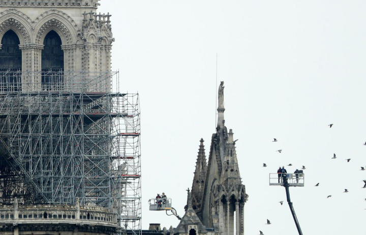 En esta imagen tomada la mañana del 16 de abril tras el incendio se puede ver mucho mejor la estatua situada sobre la la fachada norte de la catedral.