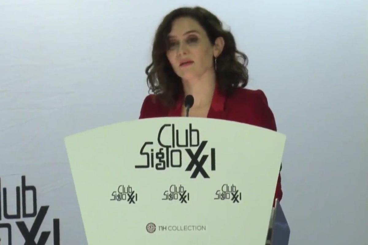 La presidenta madrileña, en el evento del Club Siglo XXI, no entró a fondo a valorar la manifestación sanitaria de este domingo en Madrid y tiró de argumentario clásico para sacar a jugar a “los crímenes de ETA”.