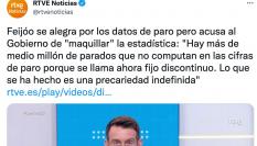 Feijóo ha afirmado que un fijo discontinuo que “no está trabajando no aparece en el paro” por lo que “se maquilla la estadística”, lo que provoca que sea “difícil hacer comparaciones”.