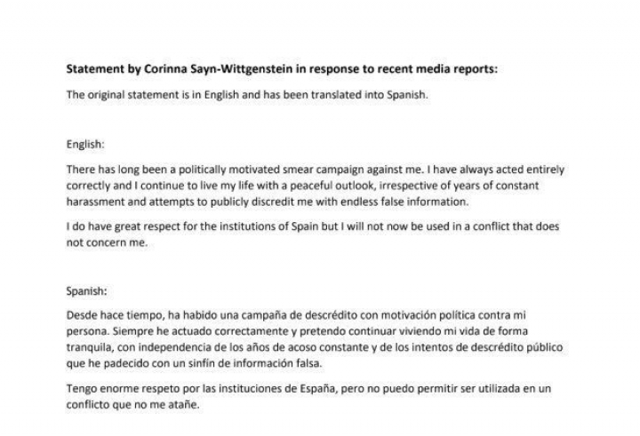 Sayn-Wittgenstein ha respondido con este comunicado a las informaciones publicadas por El Español y OKDiario, según las cuales habría desvelado que Juan Carlos I tiene cuentas en Suiza y que la utilizaba a ella como testaferro para ocultar su patrimonio en el extranjero.