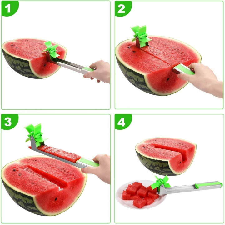 El funcionamiento del cortador de sandía es muy sencillo. Se ve bien en este vídeo de YouTube. Una vez que se ha marcado el grosos de los cubitos (hasta dos centímetros), hay que seguir sólo dos pasos: