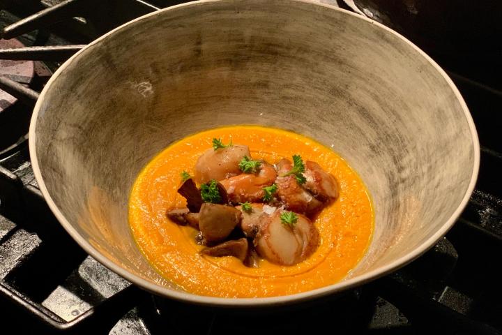 En un plato sopero, disponer las vieiras, los champiñones, añadir suavemente la crema de zanahoria y rociar con aceite de achiote y unas de perejil rizado.