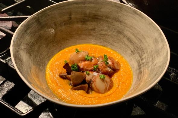 En un plato sopero, disponer las vieiras, los champiñones, añadir suavemente la crema de zanahoria y rociar con aceite de achiote y unas de perejil rizado.