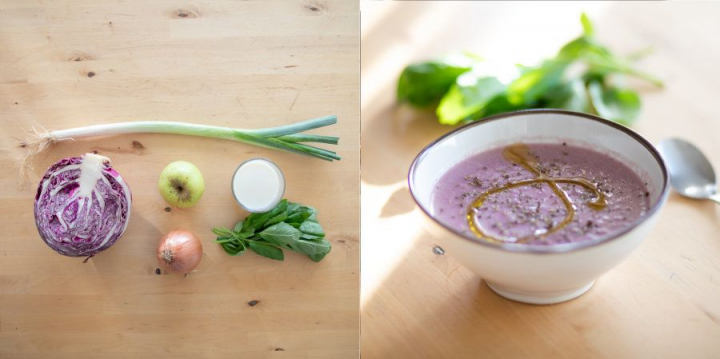 ▶️ Ingredientes (para 3 personas): 1/2 lombarda, 2 manzanas, 2 dientes de ajo, 1/2 cebolla, 2 puerros, 1 vaso de leche, sal, aceite y albahaca