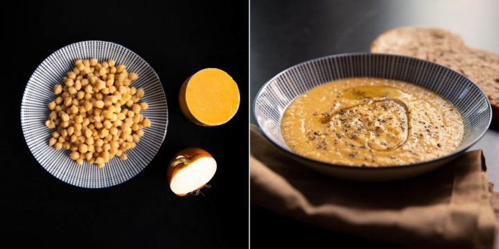INGREDIENTES: garbanzos cocidos, calabaza, cebolla, aceite de oliva, sal y especias (pimienta negra, pimentón, comino y canela). Encuentra aquí la receta completa.