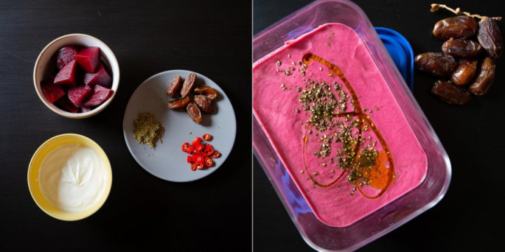 INGREDIENTES: remolacha cocida, yogures naturales, dátiles, aceite de oliva, un diente de ajo, especias y medio chile rojo (opcional). Encuentra aquí la receta completa.