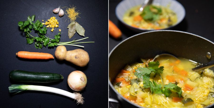 INGREDIENTES: ajo, cebolla, patata, puerro, calabacín, zanahorias, hojas de laurel, granos de maíz, cilantro, fideos, aceite de olvia virgen extra, sal, pimienta y azafrán. Encuentra aquí la receta completa.