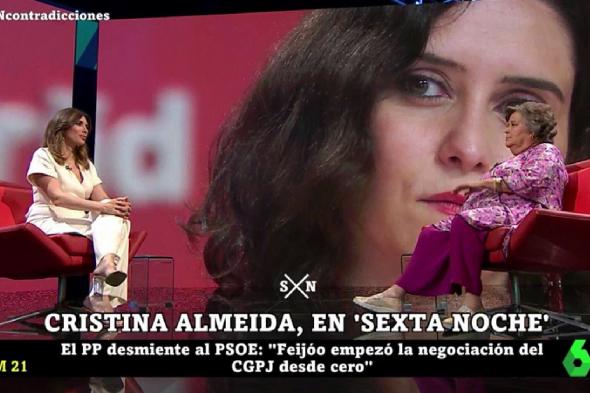 La exdiputada de IU Cristina Almeida fue entrevistada este sábado en laSexta Noche y respondió a todas las preguntas que le planteó la presentadora del espacio, Verónica Sanz.