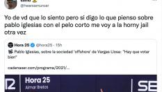 Tras escuchar las palabras de Redondo, Pardo ha preguntado: ”¿No creéis que no hace más que pedir trabajo?”. La cuenta de Twitter de Más Vale Tarde ha compartido el fragmento en la red social y el asesor ha querido responder al comentario de Pardo.