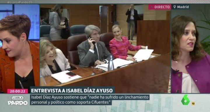 "Yo lo que digo es que ha habido un linchamiento mediático y político, ¿o no lo ha habido? ¿A usted le parece que el tratamiento que se le ha dado a ella se le está dando al resto de los políticos? No, lo que pasa es que lo alimentamos porque conviene sacarlo", ha aseverado Ayuso que ha alargado tanto su respuesta que ha obligado a otra queja de Pardo, que resoplaba en directo.