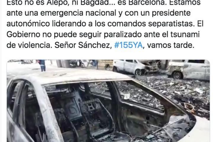 Pero no por el vídeo, sino por lo que ha escrito: “Esto no es Alepo, ni Bagdad... es Barcelona. Estamos ante una emergencia nacional y con un presidente autonómico liderando a los comandos separatistas. El Gobierno no puede seguir paralizado ante el tsunami de violencia. Señor Sánchez, #155YA, vamos tarde”.