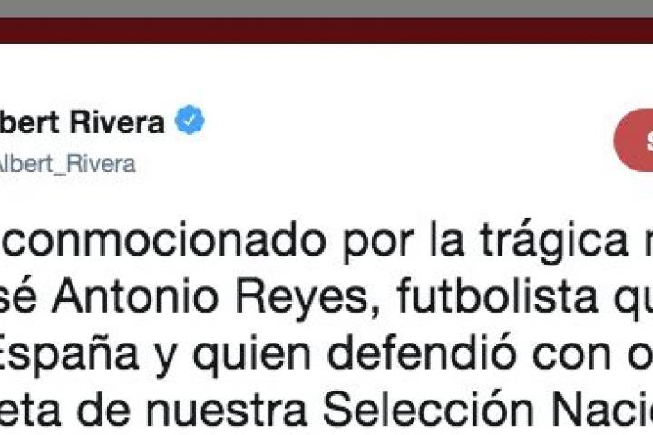 Entre ellos, el líder de Ciudadanos, Albert Rivera, quien ha escrito este mensaje en su cuenta de Twitter: “Estoy conmocionado por la trágica muerte de José Antonio Reyes, futbolista querido en toda España y quien defendió con orgullo la camiseta de nuestra Selección Nacional. Mi más sentido pésame a su familia y amigos. DEP”.