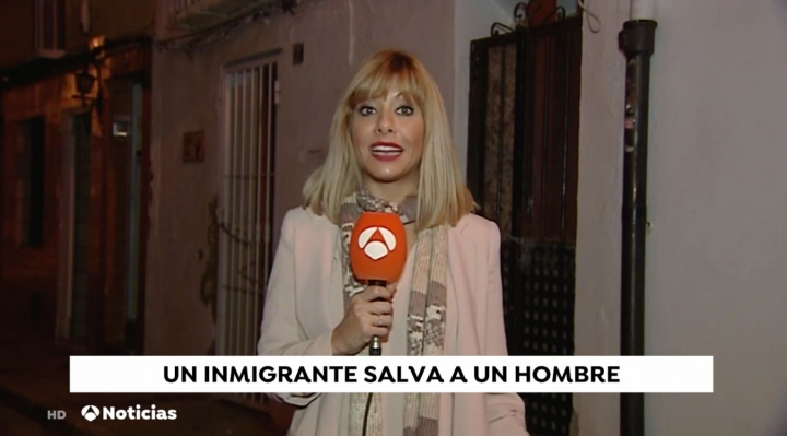 Mientras la periodista de Antena 3 narraba los hechos y se podían ver las imágenes del suceso, se podía leer el siguiente rótulo en la pantalla: “Un inmigrante salva a un hombre”.