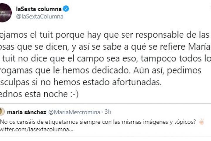 “Dejamos el tuit porque hay que ser responsable de las cosas que se dicen, y así se sabe a qué se refiere María. El tuit no dice que el campo sea eso, tampoco todos los progamas que le hemos dedicado. Aún así, pedimos disculpas si no hemos estado afortunadas. Vednos esta noche”, han afirmado.