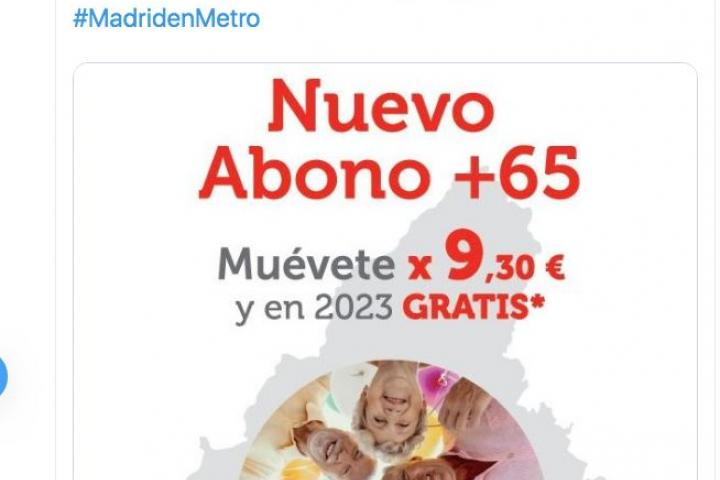 La cuenta oficial del Metro de Madrid en Twitter ha compartido este viernes una promoción sobre el nuevo abono para personas mayores de 65 años que se implantará en la Comunidad de Madrid a partir del 1 de enero de 2020.
