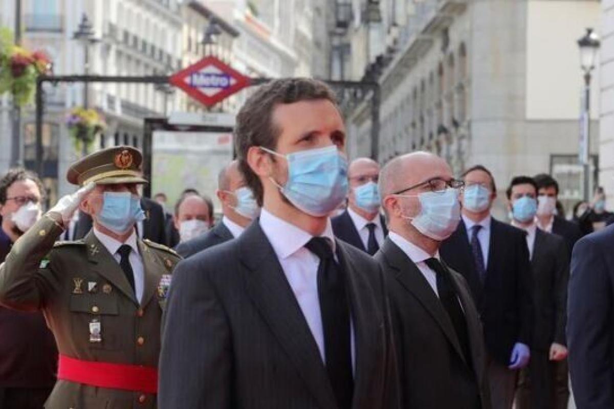 El líder del PP, Pablo Casado, que ha estado presente en el acto de Homenaje a los Héroes del 2 de Mayo que celebra la Comunidad de Madrid en la Puerta del Sol, se ha llevado las críticas de numerosos usuarios por “haber pasado revista” a los sanitarios, según han compartido diversos ciudadanos en sus redes sociales.