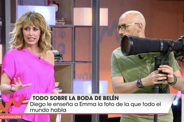 En el arranque de la edición de este sábado, Emma García encomendó en directo a Diego Arrabal la tarea de conseguir las fotos de Belén Esteban vestida de novia para enseñarlas a la audiencia del programa.