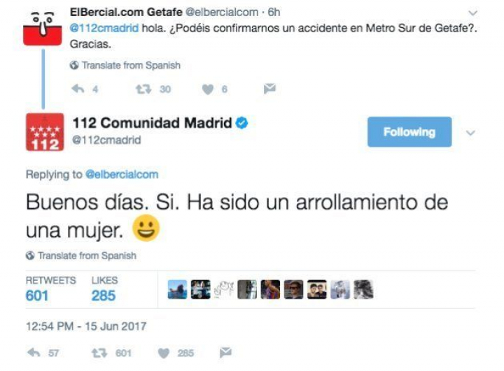 La respuesta del servicio de emergencias fue afirmativo, asegurando que se había producido "un arrollamiento de una mujer". Hasta ahí todo bien, salvo porque al final de la respuesta, el 112 añadió un emoticono con una cara sonriente.