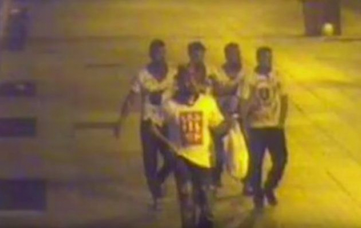 Camina sola, la calle está vacía. Cuando llega a una vía aledaña se sienta en un banco. Arrecian las lágrimas. Su llanto llama la atención de una pareja que se le acerca. Le preguntan que por qué llora. Ella, según declararon, les explica que le han robado el móvil. Le dicen que eso no es para tanto. "Cuatro chicos..." comienza a decir. La pareja entonces le pregunta si le han hecho algo. Ante su respuesta afirmativa, llaman al 112.