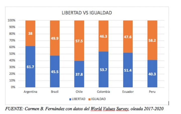 Ante la pregunta “La mayoría de la gente considera que tanto la libertad como la igualdad son importantes, pero si tuviese que elegir entre ellas, ¿cuál considera más importante?” los chilenos se orientan claramente a favor de la igualdad. Las respuestas en la subregión son variadas en la más reciente encuesta del World Values Survey: Mientras los argentinos, colombianos y ecuatorianos valoran más la libertad que la igualdad, los brasileños, chilenos y peruanos valoran más la igualdad que la libertad. Pero en Chile hay 20 puntos de diferencia a favor de la primera.