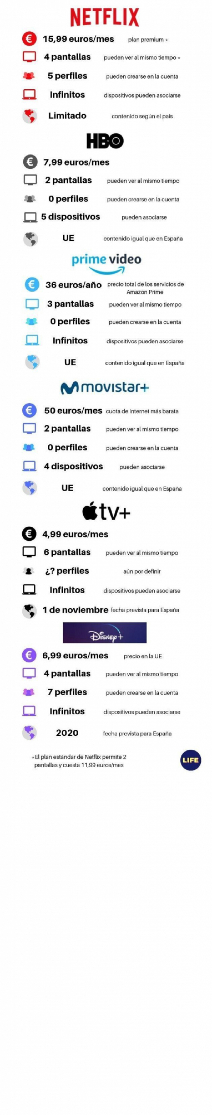 Disney+ llega a España con una gran ventaja respecto a sus principales rivales: es más barata. Si Netflix y HBO cobran 7,99 euros al mes por su plan básico, Disney+ es un euro más barato que ambas y, además, permite que haya cuatro pantallas reproduciendo contenido de manera simultánea.