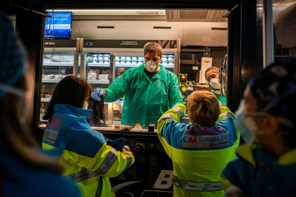 De 7 de la mañana a 11 de la noche, los sanitarios que trabajan en Ifema no están solos. Uno de los primeros días de funcionamiento del hospital de campaña montado en el recinto ferial de Madrid, el Samur se puso en contacto con una empresa con la que suele colaborar para pedirle una cafetera. La zona era un “desierto” y no tenían “ni para tomar un café”. Unas horas después, llegaba un autobús con varios voluntarios, comida y bebida gratis y la promesa de que volverían al día siguiente.