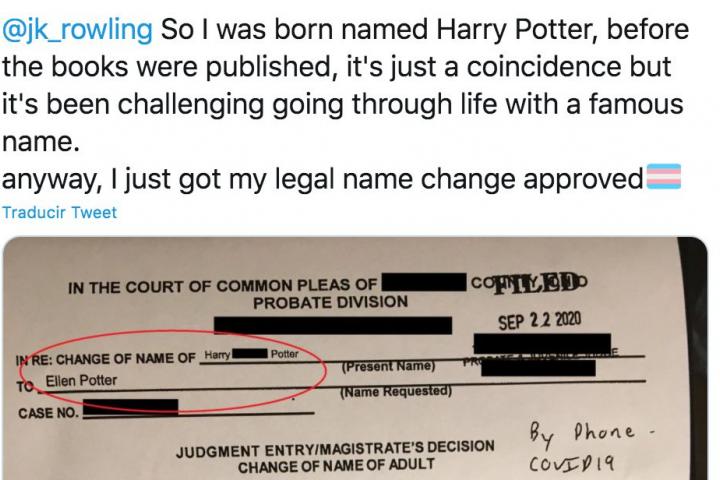 “J.K Rowling, nací llamándome Harry Potter, antes de que se publicaran los libros, es solo una coincidencia, pero ha sido un desafío vivir la vida con un nombre famoso. De todos modos, acabo de aprobar mi cambio de nombre legal”, ha escrito junto a una imagen del certificado de cambio de nombre.