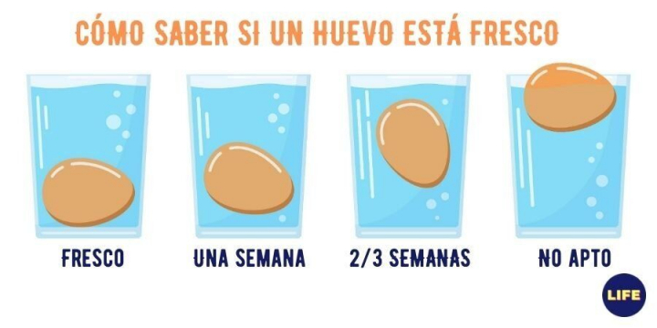 Otra fórmula para si un huevo es más o menos fresco es utilizar el truco del vaso. Consiste en llenar un recipiente con agua, introducir el huevo y esperar a ver qué lugar ocupa. Si se sumerge completamente está fresco, si flota no debería consumirse.