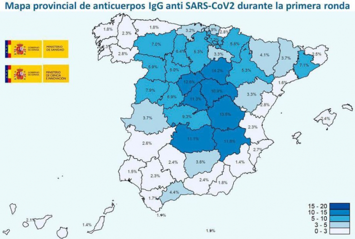 Esas provincias con más individuos que han pasado la enfermedad según el estudio son Soria (el territorio con la tasa más alta, un 14′2%) Madrid, Albacete, Segovia, Ciudad Real, Guadalajara o Cuenca, todas entre el 10 y el 13%.