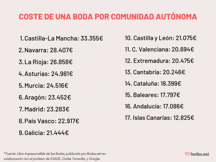Los múltiples eventos se notan en el bolsillo, pero aún queda el gran día, la boda, que en España cuesta de media 20.500 euros para 130 invitados, según los datos del Libro imprescindible de las Bodas. La cifra, eso sí, cambia en función de la comunidad autónoma en la que se celebre: la más cara es Castilla La-Mancha con un precio medio de 33.355 euros y la más barata Canarias, donde organizar un enlace supone de media 12.825 euros.