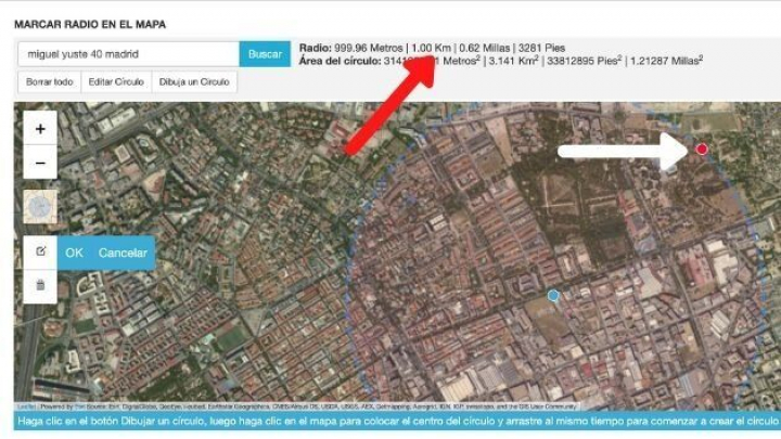 ¡No te fíes del resultado que da! Hay que fijarse que la cifra de la parte superior, al lado del epígrafe Radio, indique 1 km. Si no es así, hay que pinchar en el punto rojo del círculo para hacerlo más grande o más pequeño, según necesidades.