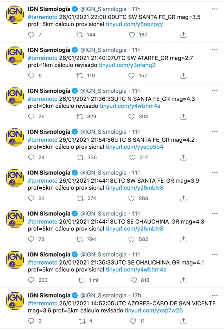 Este es el regustro de algunos de los terremotos producidos en seis horas en Granada. La tierra ha estado temblando sin parar.