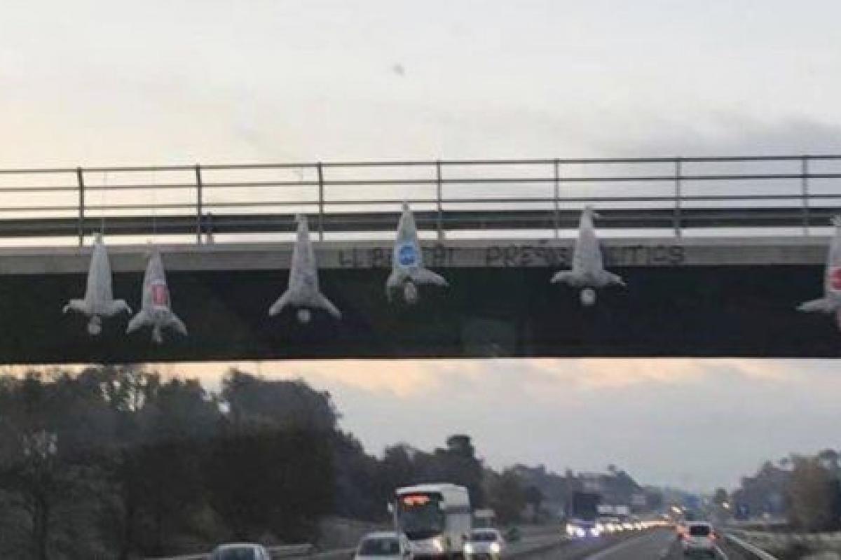 La asociación desconoce quién está detrás de la colocación de estos monigotes blancos, colgados de los pies del puente sobre la autovía que une Barcelona y Ripoll.