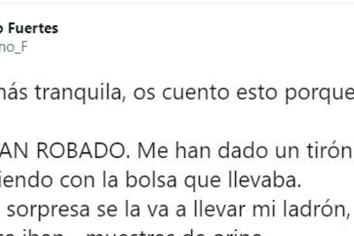 “Hoy me han robado. Me han dado un tirón y han salido corriendo con la bolsa que llevaba. Y al final la sorpresa se la va a llevar mi ladrón, porque en esa bolsa iban... muestras de orina. F por el ladrón”, ha escrito.