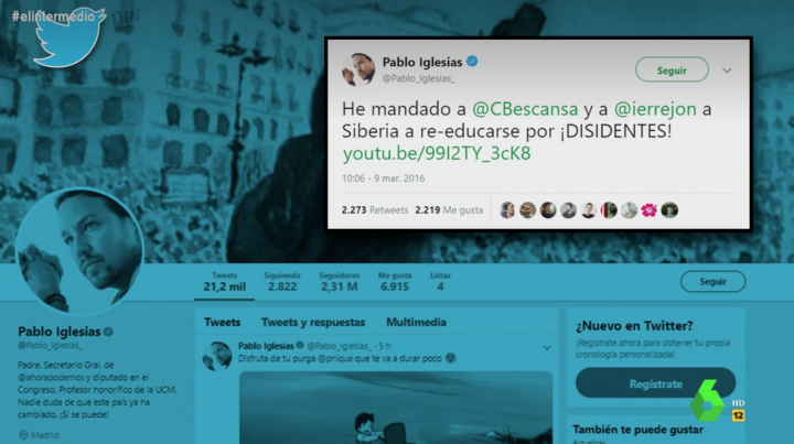 El colaborador de El Intermedio —de laSexta— Dani Mateo ha recuperado los antiguos tuits del líder de Podemos, Pablo Iglesias, que demuestran que el cruce de mensajes de este miércoles entre el propio Iglesias y Echenique para burlarse a quienes apuntaban que hay una purga en la formación morada no es motivo de tranquilidad, precisamente, para el recién cesado número dos.
