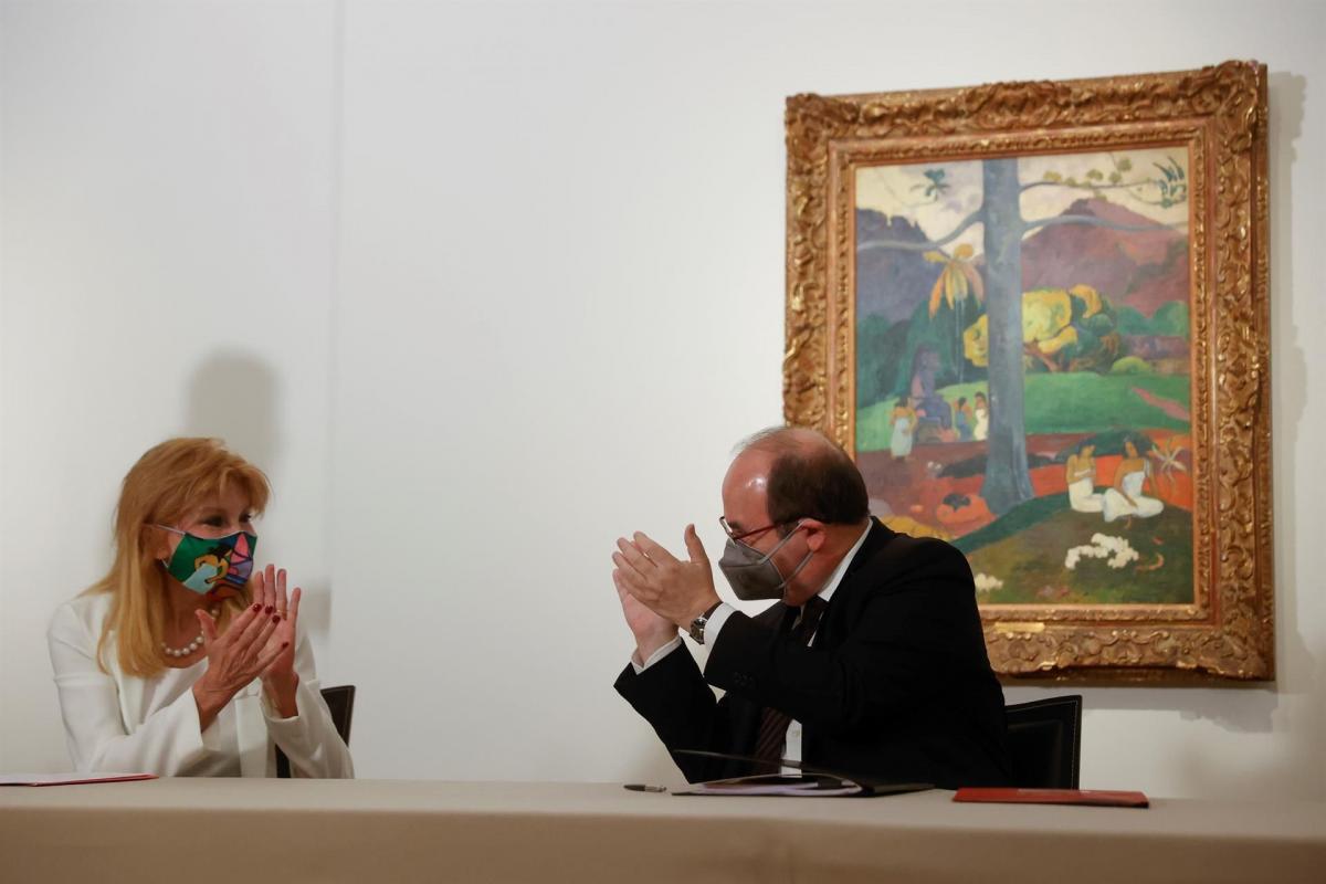 El ministro de Cultura, Miquel Iceta, y Carmen Thyssen firman el contrato de alquiler de la colección de la baronesa en el Museo Thyssen-Bornemisza por 6,5 millones de euros anuales y durante 15 años.