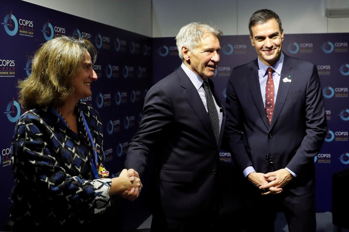 No estaba prevista, pero ni Harrison Ford ni Pedro Sánchez han querido desaprovechar la situación y se han reunido en plena COP-25. El actor estadounidense ha pedido una entrevista con el presidente y, junto a la ministra para la Transición Ecológica Teresa Ribera, han dejado la foto del día.