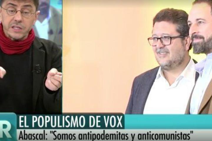 "Va con pistola este tipo, va con pistola. Da susto". El cofundador de Podemos Juan Carlos Monedero, ha respondido al líder de Vox, Santiago Abascal, quien en su entrevista en El Programa de Ana Rosa el pasado 5 de diciembre afirmó que en Podemos había "nostálgicos comunistas de la hoz y el martillo": "En su partido hay un germen tremendamente violento y a ellos nadie les llama inconstitucionales", aseguró Abascal.