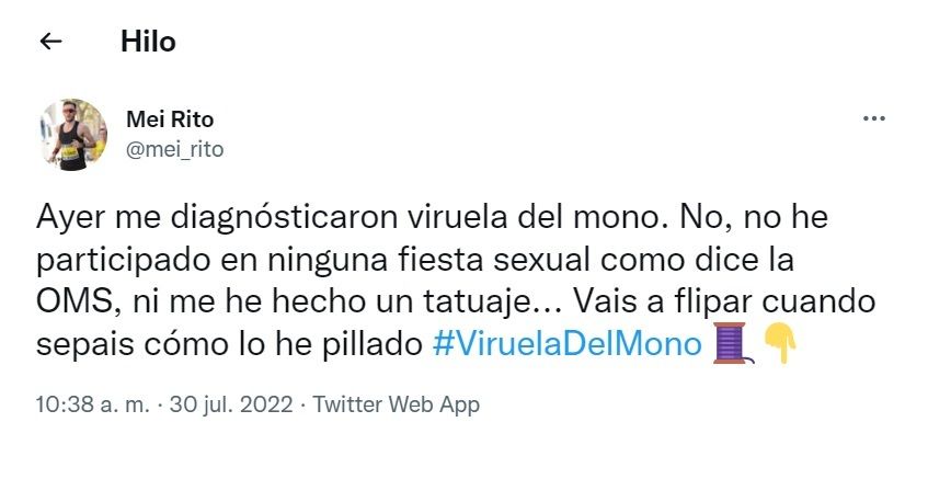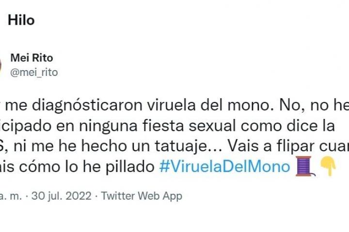 El usuario de Twitter Mei Rito ha publicado este sábado varios mensajes en redes sociales en los que ha detallado la llamativa manera en la que se contagió de la viruela del mono y su testimonio no deja de compartirse.