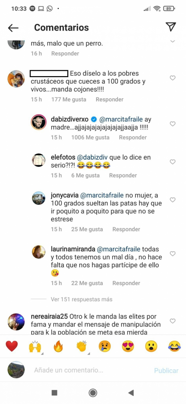 Una usuaria le recriminó ese mensaje de “celebrando la vida”. “Eso díselo a los pobres crustáceos que cueces a 100 grados y vivos... ¡Manda cojones!”, le comentó.