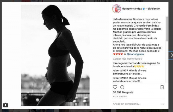 La fotografía del anuncio, en la que Fernández enseña la tripa por primera vez, tiene más de 34.000 Me gusta en menos de 15 horas.