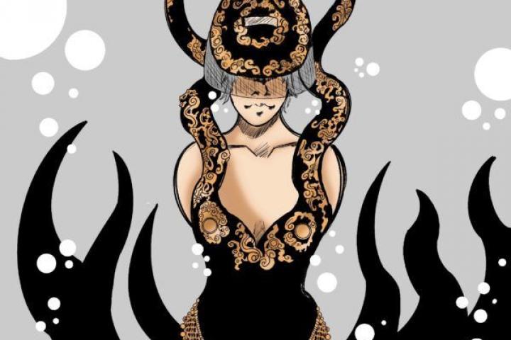 Con las joyas y el cuerpo se crea un lenguaje visual que recuerda a un diálogo entre la suavidad y la dureza. El contraste entre los humano y lo metálico se consigue gracias a unos elementos pintados a mano en el oro clásico que finalizan con una explosión de color. Inspirándose en el Renacimiento, busca lo excesivo y lo extravagante, tanto en los colores como en las propias prendas, por ejemplo un vestido de terciopelo negro con una gran rosa en el centro.