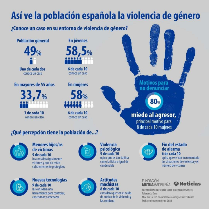 El trabajo, elaborado por la Fundación Mutua Madrileña y Antena 3 Noticias, ha encuestado a 6.159 españoles en septiembre. Entre el público femenino de todas las edades, el porcentaje también roza el 60% de quienes han vivido o sentido cerca alguna agresión machista.