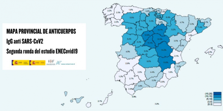 Por contra, Galicia, Asturias, Murcia, buena parte de Andalucía (cinco de sus ocho territorios: Huelva, Córdoba, Sevilla, Cádiz y Almería), más las provincias de Valencia, Tarragona y Badajoz presentan un porcentaje muy bajo, del 0 al 3% de personas que han pasado el virus.